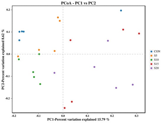 Principal coordinate analysis of the effect of feeding hydroponic wheat sprouts on the rumen bacterial community based on the unweighted unifrac distance.