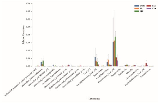 Based on the Wilcoxon rank-sum test, we found that with the increasing of substitution with hydroponic wheat sprouts, there were obviously increases in the relative abundance of [Ruminococcus]_gauvreauii_group, Olsenella, Limosilactobacillus, and Erysipelotrichaceae_UCG_009 (Figure 3). Meanwhile, there were obviously decreases in the relative abundance of unclassified_Succinivibrionaceae, Succinivibrionaceae_UCG_002, Succinimonas, Pseudobutyrivibrio, Prevotellaceae_UCG_003, and Papillibacter (Figure 3).