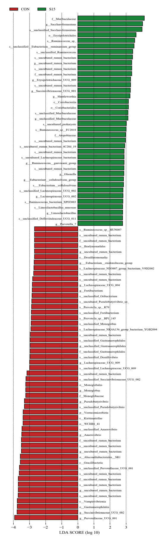 Linear discriminant analysis effect size (LEfSe) analysis of the microflora changes of growing ewes in the rumen bacterial community by substitution 15% (S15) of the basal diet with hydroponic wheat sprouts.