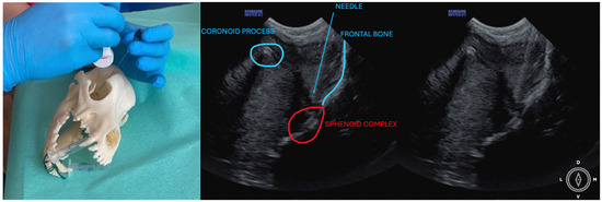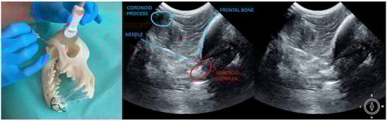 The ultrasound probe was positioned over the temporal region immediately caudal to the orbital ligament to obtain a transverse view of the caudal portion of the pterygopalatine fossa for both approaches. Slight tilting movements adjusted the probe until the following structures were identified: the frontal bone was observed as a hyperechogenic continuous line, which in the deep aspect of the pterygopalatine fossa showed an irregular structure consistent with the sphenoidal complex (optic canal, orbital fissure, and rostral alar canal). The coronoid process was also identified as a sharp, small, strongly reflective, hyperechogenic structure casting a strong acoustic shadow through the fossa (Figure 1 and Figure 2).