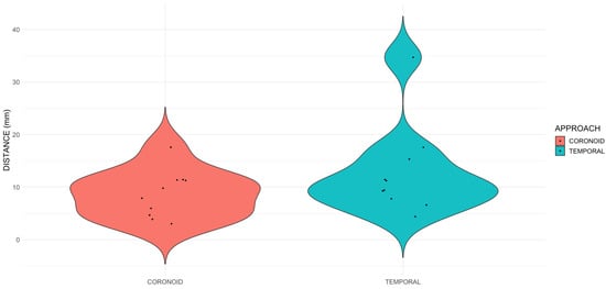 No significant differences in the distance from the tip of the needle to the target point were observed between both approaches. The median [range] of the coronoid group was 8.9 [3–17.6] mm, while in the temporal group was 10.3 [4.4–34.7] mm (Figure 3).