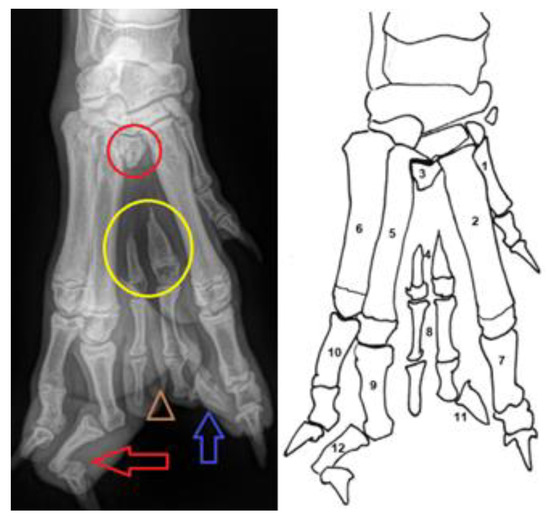 Pre-operative Radiographs (left) and line drawing (right) of the abnormal paw. (1) first metacarpal bone; (2) second metacarpal bone; (3) rudimental proximal part of the third metacarpal bone (the red circle); (4) hypoplasia of the third metacarpal bone (yellow circle); (5) fourth metacarpal bone; (6) fifth metacarpal bone; (7) proximal phalanx of the second digit; (8) double confirmation of the proximal and medial phalanx of the third digit (marked with the brown triangle); (9) proximal phalanx of the fourth digit; (10) proximal phalanx of the fifth digit; (11) note that only a single claw was developed at the third digit (blue arrow); (12) medial phalanx of the fourth digit with severe valgus deformity and distal phalanx of the fourth digit with varus deformity (red arrow).
