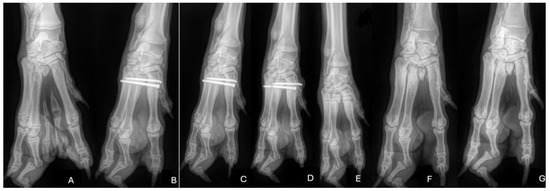 At the six-week follow-up, the patient was presented to our hospital for orthopaedic re-evaluation, including evaluation in stance and ambulation, palpation of the limb, goniometry, and radiographic examination. The dog was in good physical condition. Orthopaedic examination revealed lameness grade I/IV of the right forelimb and no pain was elicited on palpation. The range of motion (ROM) of the operated limb showed an increased angle of extension with a possible carpal extension of 215° and a slightly decreased carpal flexion angle of 42° compared to the described normal ROM of the canine carpal joint (196°/32°) [11]. The sound limb showed an almost normal ROM (195°/30°). Radiographs showed unchanged implant position and incipient fusion of the proximal aspect of the metacarpals (Figure 3C).