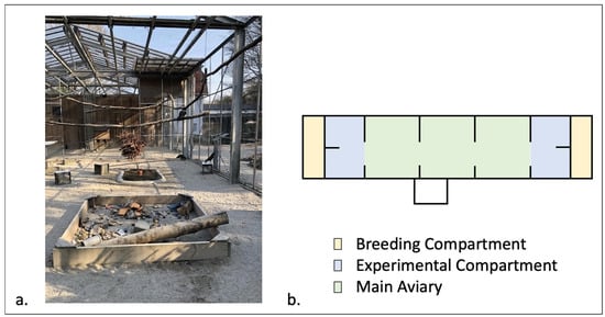 Kea aviary at Haidlhof Research Station. (a) Main aviary with hanging branches, ponds, shelter structures and feeding tables. (b) Schematic plan of the aviary.