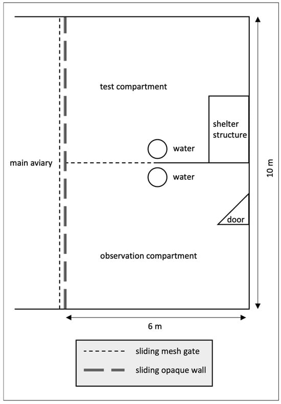 All stages of the experiment took place in the experimental compartments (10 m (W) × 6 m (L) × 4 m (H), Figure 2). These compartments could be closed off from the main aviary with a sliding wire-mesh door and visually occluded with sliding opaque white walls, which remained closed during testing to separate the subjects from the rest of the group. Each experimental compartment could be further divided into equally sized sub-compartments—an observation compartment and a test compartment—with a sliding wire-mesh gate (Figure 2).