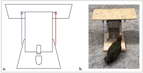 Test apparatus. (a) Schematic of apparatus with two differently colored strings on each side of the test box and a tube that released the reward into the feeding tray in front of it. (b) Kea manipulating the test box. The board on top was necessary to prevent the Kea from manipulating the top of the box or the strings from a position other than standing on the ground.
