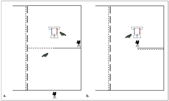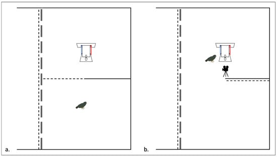 The apparatus was placed in the middle of the demonstration compartment at a distance of one meter from the closed wire-mesh door. Two cameras recorded each session. One camera was located in the test compartment (Figure 4) and recorded the demonstration and the test sessions at close range. The other was located outside the aviary behind the observation compartment (Figure 4) and recorded the behavior of the observer during the observation session.