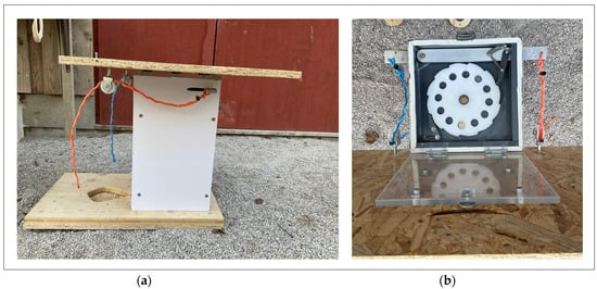 Photographs of the experimental box. (a) Side view of the box showing the functional (red) string attached to a lever and threaded through a pulley. When this string is pulled, a small piece of peanut is released into the reward tray at the bottom. (b) Top view of box with open lid. By pulling the string, a lever moves and turns the hopper to release a peanut. Only the red string on the right is functional. The blue string is attached to a dummy lever and is non-functional.