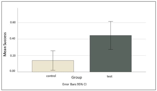 This figure shows the mean number of sessions where the subject was successful in solving the task, organized into control and test groups. The control group was successful in 14% of sessions (5/36), and the test group was successful in 44% of sessions (16/36). There was a non-significant trend towards the test groups being more successful (p = 0.056).