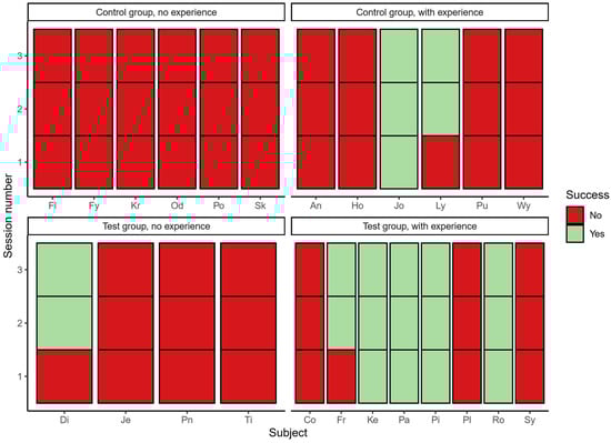We found a strong trend between individuals in the test group and individuals in the control group in overall success of solving the task (model 1, likelihood ratio test comparing full and null model χ2(1) = 3.580, p = 0.056, with test group subjects solving the task more than control group subjects (Figure 7).