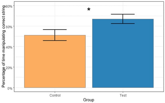This figure shows the mean proportion of time that the subjects spent manipulating the correct string during a trial, compared to the total string manipulation time, organized into control and test groups. The control group manipulated the correct string in a proportion of 0.51 of the time, and the test group manipulated the correct string significantly more, in a proportion of 0.67 of the time (* p = 0.029).