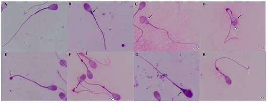 Figure 1. Morphological defects in European red deer epididymal spermatozoa stored in a liquid state and in the epididymides at 5 °C. (A)—normal spermatozoa; (B)—spermatozoa with proximal cytoplasmic droplets (⭡); (C)—spermatozoa with head defects (⭡); (D)—spermatozoa with head defects (⭡) and damaged acrosomes (Δ); (E)—spermatozoa with distal cytoplasmic droplets (⭡); (F)—spermatozoa with curled tails (⭡), spermatozoa with head defects (Δ); (G)—spermatozoa with midpiece defects (⭡); (H)—spermatozoa with a single bent tail (⭡). Scale bars = 5 µm.