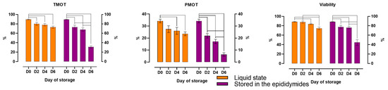 Figure 2. The effect of storage time on the motility and viability of spermatozoa stored in a liquid state and in the epididymides at 5 °C. TMOT, total motility; PMOT, progressive motility; Viability, live spermatozoa. The mean (±SEM) values of stored epididymal spermatozoa are presented. The results are significant at p ≤ 0.05.
