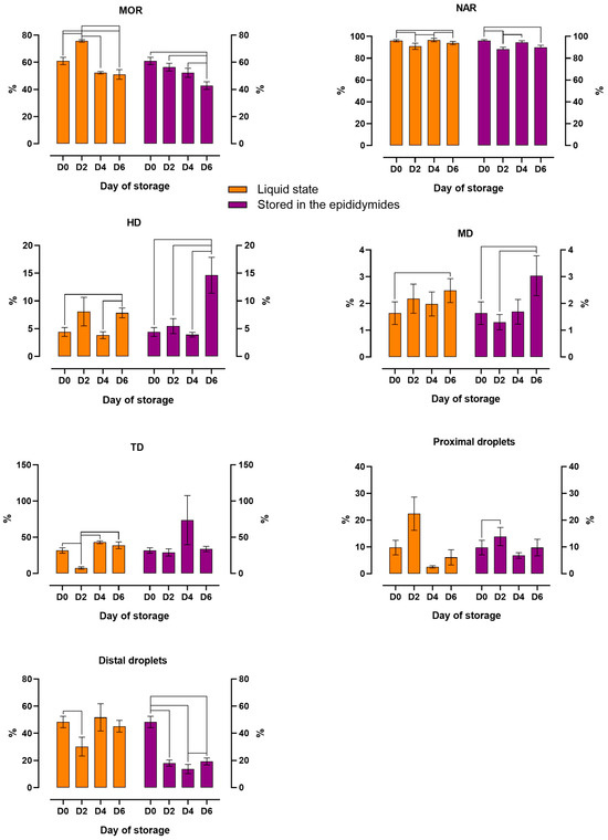 Figure 3. The effect of storage time on the morphology of spermatozoa stored in a liquid state and in the epididymides at 5 °C. MOR, normal sperm; NAR, normal apical ridge acrosomes; HD, head defects; MD, midpiece defects; TD, tail defects; proximal droplets; distal droplets. The mean (±SEM) values of stored epididymal sperm are presented. The results are significant at p ≤ 0.05.