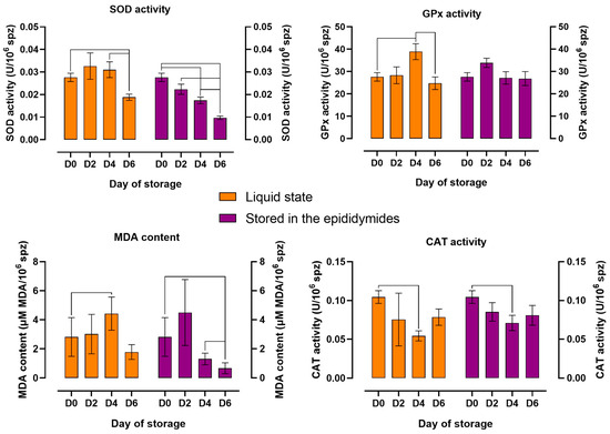 Figure 4. The effect of storage time on the activity of antioxidant enzymes and lipid peroxidation in spermatozoa stored in a liquid state and in the epididymides at 5 °C. SOD activity, superoxide dismutase activity; GPx activity, glutathione peroxidase activity; MDA content, malondialdehyde content; CAT activity, catalase activity. The mean (±SEM) values of stored epididymal sperm are presented. The results are significant at p ≤ 0.05.