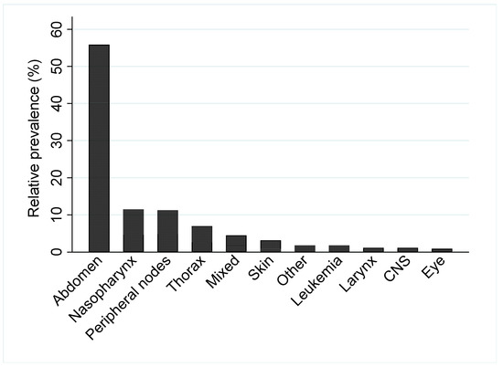 Mixed forms were present in 20 cases, 12 cases (60%) of which were thoracic and abdominal. The combination of nodes of the neck with thoracic or abdomen sites (3 cases, 15%) and nasal cavity with oral or neck sites (3 cases, 15%); 1 case of subcutaneous and rectal involvement; and 1 case of abdominal and mammary chain involvement represented the remaining combinations in the mixed form lymphoma.