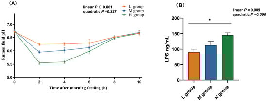 Effect of different soluble carbohydrate-to-neutral detergent fiber ratios in diets on pH (A) of rumen fluid and LPS (B) concentration of rumen epithelium. Data were expressed as mean ± SEM. * p < 0.05 mean significant differences. L group = SCHO-to-NDF ratio was 1.0; M group = SCHO-to-NDF ratio was 1.5; H group = SCHO-to-NDF ratio was 2.0.