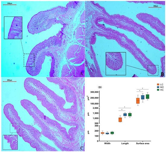 Effect of different soluble carbohydrate-to-neutral detergent fiber ratios in diets on rumen epithelial morphology of lambs. Error lines represent maximum and minimum values. (A) Morphology of rumen papillae in the L group; (B) morphology of rumen papillae in the M group; (C) morphology of rumen papillae in the H group. (D) Morphological statistics of rumen papillae. * p < 0.05 mean significant difference. L group = SCHO-to-NDF ratio was 1.0; M group = SCHO-to-NDF ratio was 1.5; H group = SCHO-to-NDF ratio was 2.0.