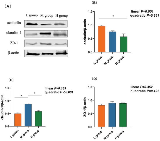As the proportion of SCHO to NDF in the diet increased, the occludin mRNA and protein expression levels linearly decreased (plin = 0.001) and were significantly lower in the high-SCHO:NDF group than in the low-SCHO:NDF group (p < 0.05, Table 3 and Figure 3C). The claudin-1 mRNA level increased and then decreased in a linear (plin = 0.021) and quadratic (pquad = 0.003) manner, and the claudin-1 mRNA expression in the medium-SCHO:NDF group was significantly greater than that in the low-SCHO:NDF group (p < 0.05). The protein abundance was also significantly greater in the medium group than that in the low- and high-SCHO:NDF groups (p < 0.05) (Figure 3, Table 3).