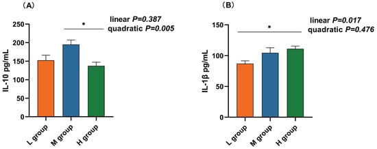 The rumen IL-10 concentration in the medium-SCHO:NDF (195.00 pg/mL) group was significantly greater than that in the high-SCHO:NDF (137.41 pg/mL) group (p < 0.05, Figure 4A). Polynomial analyses revealed that the level of IL-10 increased and then decreased quadratically (pquad = 0.005) and that the levels of IL-1β (plin = 0.017), IL-6 (plin < 0.01) and TNF-α (plin = 0.006) increased linearly with increasing SCHO:NDF levels in the diet. The IL-1β concentration was significantly greater in the high-SCHO:NDF (111.01 pg/mL) group than in the low-SCHO:NDF (86.98 pg/mL) group (p < 0.05, Figure 3B). The IL-6 concentration in the high-SCHO:NDF (56.30 pg/mL) group was significantly greater than that in the low-SCHO:NDF (34.41 pg/mL) group, and that in the medium-SCHO:NDF (46.69 pg/mL) group was also significantly lower than that in the low-SCHO:NDF (34.41 pg/mL) group (p < 0.05, Figure 4C). Furthermore, the concentration of TNF-α was significantly greater in the high-SCHO:NDF (147.76 pg/mL) group than in the low- and medium-SCHO:NDF (122.00 and 125.96 pg/mL) groups (p < 0.05, Figure 4D).