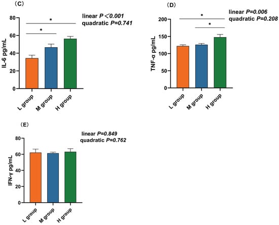 Effect of different soluble carbohydrate-to-neutral detergent fiber ratios in diets on rumen epithelium inflammatory factors: (A) IL-10, (B) IL-1β, (C) IL-6, (D) TNF-α, and (E) IFN-γ concentrations. Data were expressed as mean ± SEM. * p < 0.05 mean significant differences. L group = SCHO-to-NDF ratio was 1.0; M group = SCHO-to-NDF ratio was 1.5; H group = SCHO-to-NDF ratio was 2.0.