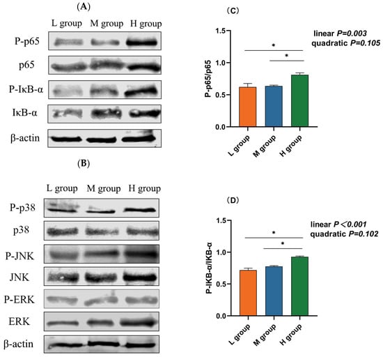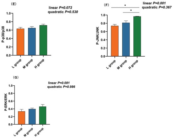 Effect of different soluble carbohydrate-to-neutral detergent fiber ratios in diets on phosphorylation levels of (C) p65 and (D) IκB-α, (E) p38, (F) JNK, and (G) ERK in the rumen epithelium. (A,B) Representative bands from Western blot analysis. Data were expressed as mean ± SEM. * p < 0.05 mean significant differences. L group = SCHO-to-NDF ratio was 1.0; M group = SCHO-to-NDF ratio was 1.5; H group = SCHO-to-NDF ratio was 2.0.