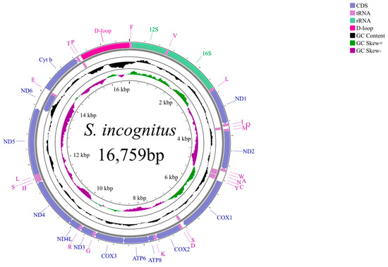 The complete mitochondrial genome map of S. incognitus. The outer circle shows the arrangement of genes. External genes are encoded by the positive strand (5′ → 3′), and internal genes are encoded by the negative strand (3′ → 5′). The second circle shows GC content. The innermost circle shows GC skew.