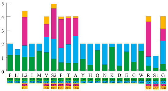 The relative synonymous codon usage (RSCU) of the mitochondrial genome of S. incognitus. The X-axis depicts the codons employed along with their various combinations of synonymous codons, represented by different colors. The Y-axis presents the RSCU values.