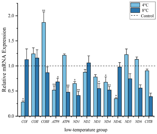 Transcript levels of 13 PCGs in lizards were assessed under low-temperature stress, as compared to 25 °C values. The bars represent the mean ± standard deviation of the original data. “*” indicates a significant difference between different treatment groups and controls, p < 0.05 (*), p < 0.01 (**).