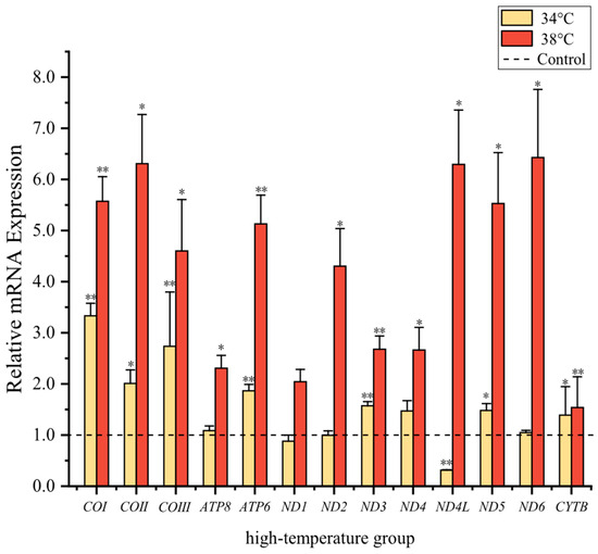 Transcript levels of 13 PCGs in lizards were assessed under high-temperature stress, as compared to 25 °C values. The bars represent the mean ± standard deviation of the original data. “*” indicates a significant difference between different treatment groups and controls, p < 0.05 (*), p < 0.01 (**).