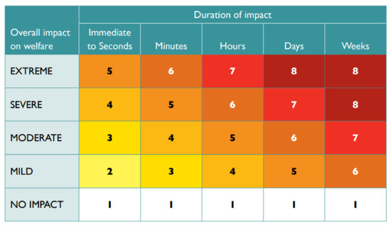 Scoring matrix for Part A: overall welfare impact. Scores range from 1 (most humane) to 8 (least humane). Source: Sharp and Saunders (2011 [18], p. 49), then reprinted with permission in Beausoleil et al. (2022) [81].
