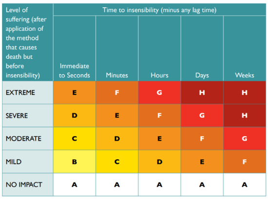 Impact scale for Part B: assessment of mode of death. Scores range from A (most humane) to H (least humane). Source: Sharp and Saunders (2011 [18], p. 52), then reprinted with permission in Beausoleil et al. (2022) [81].