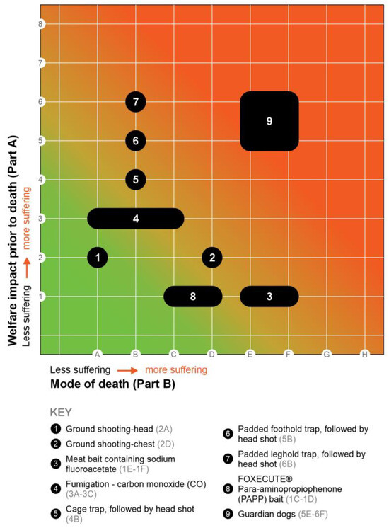 Table 3 shows several fox control methods and their RH scores, based on the model developed by Sharp and Saunders (2011) [18]. Figure 3 shows these methods relative to each other. For example, ground shooting in the head and chest are both considered to inflict an overall mild impact for a short duration (immediate to seconds), which leads to a score of 2 for Part A. For Part B (mode of death), ground shooting in the head (when accurate) is considered to lead to insensibility very rapidly without suffering (hence, score A), whereas ground shooting in the chest can take seconds to minutes before the animals become insensible, and “the time to loss of consciousness and the time to death will depend on which tissues are damaged and, in particular, on the rate of blood loss and hence the rate of induction of cerebral hypoxaemia” ([48], p. 2), giving a score of D.