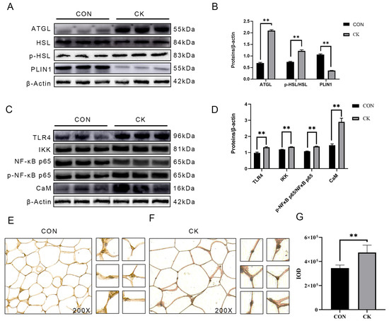 The abundance of ATGL, HSL, p-HSL, PLIN1, TLR4, IKK, p-NF-κB p65, NF-κB p65, and CaM in adipose tissue of healthy cows (n = 6) and cows with clinical ketosis (n = 6). CON = Control group, CK = Clinical ketosis group, ATGL = Adipose triacylglycerol lipase, HSL = Hormone-sensitive lipase, p-HSL = Phosphorylated hormone-sensitive lipase, PLIN1 = Perilipin-1, TLR4 = Toll-like receptor 4, IKK = Inhibitor of nuclear factor κB kinase subunit β, p-NF-κB p65 = Phosphorylated nuclear factor κB p65, NF-κB p65 = Nuclear factor κB p65, CaM = Calmodulin. (A) Representative Western blots of ATGL, HSL, p-HSL, and PLIN1. (B) Relative protein abundance of ATGL, p-HSL/HSL, and PLIN1. (C) Representative Western blots of TLR4, IKK, p-NF-κB p65, NF-κB p65, and CaM. (D) Relative protein abundance of TLR4, IKK, p-NF-κB p65/NF-κB p65, and CaM; (E) A picture under the microscope of adipose tissue from healthy dairy cows (200×). (F) A picture under the microscope of adipose tissue from clinical ketosis (200×). (G) Quantitative analysis of immunohistochemistry of CaM from adipose tissue of healthy and ketosis cows. This experiment was repeated thrice, and data are presented as mean ± SEM; ** p < 0.01.