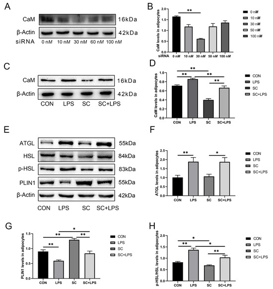 Effect of different siRNA concentrations on CaM abundance in adipocytes and the presence or absence of LPS on CaM, ATGL, HSL, p-HSL, and PLIN1 abundance in adipocytes. Adipocytes were transfected with CaM small interfering RNA (SC) for 48 h and cultured for 3 h in the presence or absence of LPS (4 μg/mL). CON = Control, LPS = Lipopolysaccharide treatment, SC = Calmodulin silencing, SC + LPS = Calmodulin silenced and lipopolysaccharide treatment, CaM = Calmodulin, ATGL = Adipose triacylglycerol lipase, HSL = Hormone-sensitive lipase, p-HSL = Phosphorylated hormone-sensitive lipase, PLIN1 = Perilipin-1. (A) Representative Western blots of CaM silenced by different siRNA concentrations. (B) Relative protein abundance of CaM after silencing CaM with varying concentrations of si-RNA. (C) Representative Western blots of CaM abundance in the case of silenced CaM and LPS stimulation. (D) Relative protein abundance of CaM. (E) Representative Western blots of ATGL, HSL, p-HSL, and PLIN1. (F) Relative protein abundance of ATGL. (G) Relative protein abundance of PLIN1. (H) Relative protein abundance of p-HSL/HSL. This experiment was repeated thrice, and data are presented as mean ± SEM: * p < 0.05, ** p < 0.01.