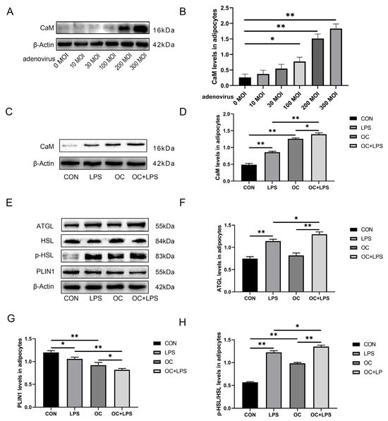 Effect of adenoviruses with different infection indices on CaM abundance. Adipocytes were transfected with OC-CaM (OC) for 48 h and cultured for 3 h in the presence or absence of LPS (4 μg/mL). CON = Control, LPS = Lipopolysaccharide treatment, OC = Calmodulin overexpression, OC + LPS = Calmodulin overexpression and lipopolysaccharide treatment, CaM = Calmodulin, ATGL = Adipose triacylglycerol lipase, HSL = Hormone-sensitive lipase, p-HSL = Phosphorylated hormone-sensitive lipase, PLIN1 = Perilipin-1. (A) Representative Western blots of CaM overexpression by different adenovirus concentrations. (B) After overexpression of CaM by adenovirus at various concentrations relative protein abundance of CaM. (C) Representative Western blots of CaM abundance under CaM overexpression and LPS stimulation conditions. (D) Relative protein abundance of CaM. (E) Representative Western blots of ATGL, HSL, p-HSL, and PLIN1. (F) Relative protein abundance of ATGL. (G) Relative protein abundance of PLIN1. (H) Relative protein abundance of p-HSL/HSL. This experiment was repeated thrice, and data are presented as mean ± SEM: * p < 0.05, ** p < 0.01.