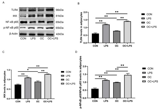 Total protein from adipose tissue and adipocytes was extracted using a protein extraction kit (Beyotime Biotechnology, Shanghai, China) according to the manufacturer’s instructions. For adipose tissue, 70 mg of adipose tissue was taken, RIPA (Roche, Shanghai, China) tissue lysate was added, and adipose tissue was subsequently added to a grinder. The ground tissue was centrifuged using a centrifuge (3–16 KL, SIGMA, Osterode, Germany) at 12,000× g for 10 min at 4 °C. Protein extraction reagent was added to the centrifuged supernatant, thoroughly mixed, and re-centrifuged at 12,000× g at 4 °C for 10 min to obtain total adipose tissue protein. For adipocytes, cells were collected from 0.25% trypsin-EDTA (T1320, Solarbio, Beijing, China) and digested by centrifugation at room temperature, 1500× g for 5 min. After discarding the supernatant, the centrifugation steps described above were repeated after the resuspension of the cells using PBS. After discarding the supernatant, the cells were resuspended in precooled lysis buffer and centrifuged at 12,000× g for 10 min at 4 °C to obtain total protein from the adipocytes. Total protein in adipose tissue and adipocytes was determined using the BCA method. Typically, 30 μg of protein from each sample was separated using sodium dodecyl sulfate-polyacrylamide gel electrophoresis (SDS-PAGE) with known molecular weight markers, and the proteins were transferred to a 0.45-μm PVDF membrane. The PVDFs were incubated with primary antibodies anti-β-actin (1:1000, Proteintech Group, Chicago, IL, USA), anti-Toll-like receptor 4 (TLR4, 1:1000, Proteintech Group, Chicago, IL, USA), anti-IKK (1:1000, Proteintech Group, Chicago, IL, USA), anti-NF-κB (1:4000, Proteintech Group, Chicago, IL, USA), anti-p-NF-κB (1:2000, Cell Signaling Technology, Boston, MA, USA), anti-ATGL (ATGL, 1:1000, Proteintech Group, Chicago, IL, USA), and anti-hormone-sensitive lipase (HSL, 1:2000, Proteintech Group, Chicago, IL, USA). Anti-phosphorylated hormone-sensitive lipase (p-HSL, 1:1000, ABclonal, Boston, MA, USA), anti-perilipin-1 (PLIN1, 1:2000, ABclonal, Boston, MA, USA), and anti-calmodulin (CaM, 1:1000, Proteintech Group, Chicago, IL, USA) were incubated together and incubated overnight at 4 °C. After washing the PVDF membrane with Tris-buffered saline-Tween, the membrane was incubated with the following secondary antibodies: HRP-labeled goat anti-mouse IgG (1:10,000, Proteintech Group, Chicago, IL, USA) and HRP-labeled goat anti-rabbit IgG (1:10,000, Proteintech Group, Chicago, IL, USA). The membrane was washed using Tris-buffered saline-Tween. The immunoreactive bands were enhanced with a chemiluminescence solution (Biosharp, Beijing, China). The bands were imaged using a Protein Simple imager (ProteinSimple, San Jose, CA, USA), and the gray-scale values were analyzed using Image-Pro Plus (Media Cybernetics Inc., Warrendale, PA, USA).