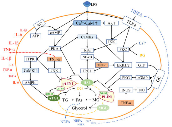 Moreover, NEFA produced by excessive lipolysis can directly act on TLR4 or IKK, further activating the NF-κB pathway and aggravating the inflammatory response [50]. Our assay found that the abundance of CaM, ATGL, and p-HSL was significantly enhanced in adipocytes after LPS stimulation, while the expression of PLIN1 was significantly attenuated, indicating enhanced lipolysis. Furthermore, adipose tissue lipolysis was enhanced in cows with clinical ketosis, as characterized by the increased serum levels of NEFA and BHB. Simultaneously, the TLR4/IKK/NF-κB pathway in adipose tissue was activated, and the levels of TNF-α, IL-1β, and IL-6 in serum were upregulated. Therefore, our study demonstrated that LPS-induced inflammation could enhance lipolysis via multiple pathways on ATGL, HSL, and PLIN lipolysis-related proteins, while NEFA released from lipolysis could act on TLR4 further to activate TLR4/IKK/NF-κB pathway-mediated inflammation.