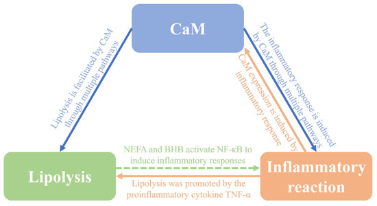 Figure 7 displays that inflammatory cytokines released upon activation of NF-κB, such as TNF-α, could mediate lipolysis and upregulate the abundance of CaM through ATGL, HSL, and PLIN1. NEFA and BHB released from excessive lipolysis aggravate the inflammatory response, creating a positive feedback loop of CaM, inflammation, and lipolysis signals.