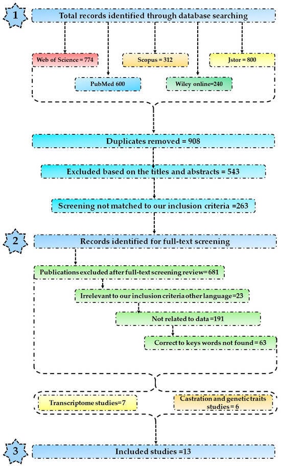 The process of selecting materials for inclusion in the database focused on published works spanning the years 2010 to December 2023 (Supplementary File S1, Table S1). To be considered for inclusion, a work must pertain to sheep production under specific conditions. These conditions included studies conducted within two primary production systems: genetics perimeter, transcriptome, and feedlot and free-range. We searched our data with keywords: sheep, meat quality traits, growth muscle, and comparative transcriptome. In the feedlot system, animals are confined to pens equipped with necessary care facilities. Gaspar et al. [] establish this criterion. Alternatively, in the free-range system, animals graze on pastures and fodder trees throughout the day, with the possibility of returning to the farm at night, as outlined by Zhang et al. [].