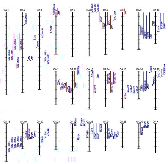 QTLs/associations for various meat carcass and quality traits in sheep are shown in Supplementary File S2, Figures S1–S8, and include meat sensory characteristics (Figure S1), meat carcass traits/anatomy (Figure S2), chemistry/pH (Figure S3), fatness (Figure S4), fat acid content (Figure S5), meat color (Figure S6), meat texture (Figure S7), and growth and carcass characteristics (Figure S8).