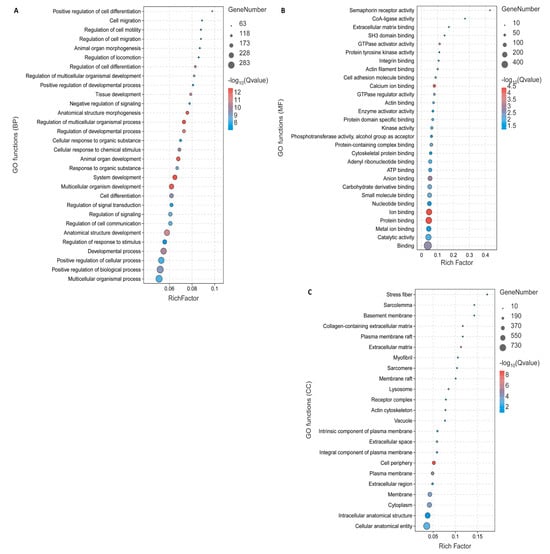 The enriched Gene Ontology (GO) terms associated with the functions of DEGs were identified. (A) A bar chart representing the top 30 biological process (BP), (B) cellular component (CC), and (C) molecular function (MF) terms from the enrichment analysis of DEGs in the growth muscles.