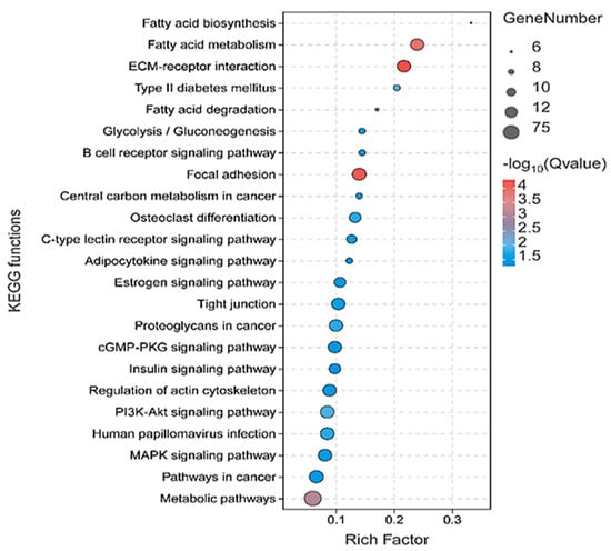The ECM is crucial for keeping tissues in balance, with a variety of important molecules found within it in adipose tissue. These include glycosaminoglycans, collagen, elastin, fibronectin, and laminin []. The interaction between the ECM and cell surface molecules, like integrins, plays a crucial role in regulating various cellular processes including growth, motility, and apoptosis []. Interestingly, the signaling cascade involved in ECM receptor interaction has been recognized as a significantly enriched pathway in DEGs between fat- and thin-tailed sheep breeds in various previous investigations, as well as in DEGs between lean and obese individuals []. Moreover, research has demonstrated that the communication between ECM components and transmembrane receptors of adipocytes is associated with site-specific adipogenesis in cattle [].