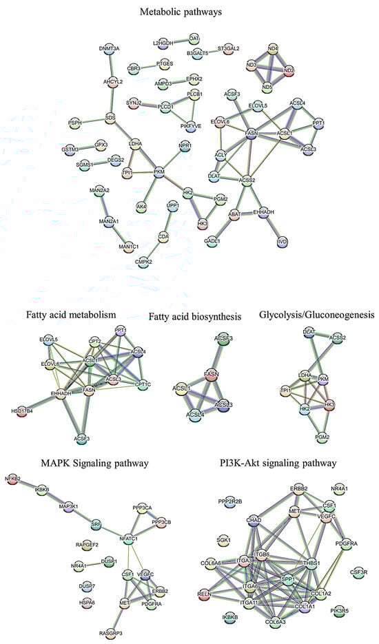 Explorations into the functions of Fatty-Acid-Synthase (FASN), Acyl-CoA Synthetase Long-Chain-Family-Member 1 (ACSL1), and Palmitoyl-protein thioesterase-1 (PPT-1) genes in sheep fatty acid metabolism have provided significant insights. FASN is a fundamental enzyme in de novo fatty acid biosynthesis []. Studies in sheep have underscored its importance in governing fat deposition and composition, as it affects traits like marbling and adiposity []. ACSL1 performs a crucial role in fatty acid metabolism through the catalysis of acyl-CoA production, a pivotal process in fatty acid activation for various metabolic pathways, such as oxidation and complex lipid synthesis []. Investigations in sheep have revealed correlations between ACSL1 expression levels and rates of fatty acid oxidation, indicating its role in modulating energy metabolism and lipid utilization []. PPT-1 is an enzyme involved in the breakdown of thioester linkages in palmitoylated proteins, potentially influencing various cellular activities, including lipid metabolism []. Although specific studies focusing on PPT1 in sheep fatty acid metabolism are limited, research in other species suggests its potential involvement in regulating lipid balance and cellular signaling pathways []. Conversely, specific pathways relevant to fat metabolism, such as extracellular matrix (ECM) receptor interaction, focal adhesion, and the PI3K-Akt signaling pathway were found to be significantly enriched within the pink sub-network, shedding light on the mechanisms underlying sheep fat-tail development. Noteworthy genes associated with these pathways including COL1A1, SPP1, ITGA1, VEGFA, ITGA2, COL4A6, COL6A6, PDGFRA, SDC1, and COL6A3 were either situated within QTLs linked to fatness or successfully passed a minimum of 50% of the Jackknife tests (Supplementary File S1, Table S6), indicating their probable involvement in fat-tail morphogenesis. Focal adhesion, closely associated with the ECM, functions as a physical connection to the ECM. As a result, the differentially expressed genes (DEGs) linked to these two pathways exhibited notable similarities (Supplementary File S1, Tables S6 and S7).