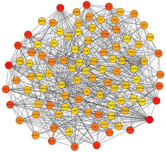 3.5. PPI Network of Top 100 Genes Associated with Growth Muscle