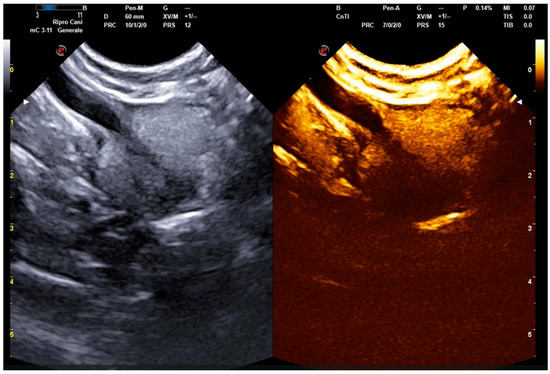 Dual-live function displaying simultaneously B-mode and contrast-enhanced images (My Lab X8 VET, Esaote, Genova, Italy). Detail of the pre-treatment (D0) wash-in phase in a 4-year-old Mixed Breed.