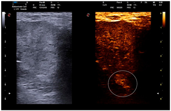 For contrast-enhanced ultrasonography (CEUS), a sulfur hexafluoride contrast agent was used (SonoVue®, Bracco Imaging, Milan, Italy). Briefly, the agent was reconstituted, following the manufacturer’s recommendations, by diluting the contrast agent powder with 5 mL of sterile saline and shaking vigorously for 20 s. All animals received an intravenous dose of 0.03–0.04 mL/kg, followed by a bolus of 5 mL of sterile saline, to wash in the contrast agent [22,31]. The machine allowed a dual-live function with B-mode and contrast images displayed simultaneously (Figure 1). For all patients, the length of the wash-in and wash-out phases of the contrast agent in the prostate were assessed (expressed in seconds) using a timer activated simultaneously with contrast inoculation [35]. The wash-in phase was calculated starting from the arrival of the contrast at the gland until reaching the peak intensity (time to reach peak intensity—TTP) [41]; the wash-out phase was considered the period from TTP until the contrast was eliminated.