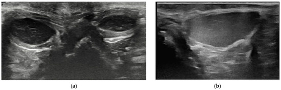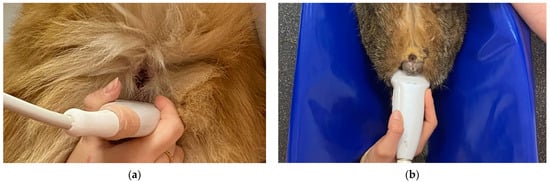 The ultrasound examination was performed by one examiner (INP) throughout the study using a Samsung RS85 (Samsung Medison Co., Ltd., Seoul, Republic of Korea) ultrasound machine with a microconvex (CF4–9 MHz) and linear transducer (LA4–18B MHz) in dogs and linear transducer in cats. The highest possible frequency was used to optimize the image quality. In dogs, the examination was performed in a standing position with the tail reflected over the dorsum (Figure 1a). Cats were positioned in dorsal recumbency in a patient positioning cradle with hind limbs pulled and fixed in the cranial direction (Figure 1b). The ultrasound examination was performed without clipping; hair was parted, and the transmission gel for the scanning was used. Dorsal and sagittal images of the anal sacs were obtained. For our research, data from the dorsal plane were used (Figure 2). All static images and short cine-loops were stored in the Picture Archiving and Communication System (PACS) of the Department of Diagnostic Imaging.