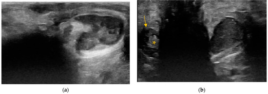The anal sacs were homogenous in 129/137 dogs (94.2%) and 125/131 cats (95.4%). The content of homogenous anal sacs was mostly hypoechoic, detected in 60/129 dogs (46.5%) and 60/125 cats (48%). Of that, hyperechoic points or unformed echogenic material was present in 55/60 dogs and 55/60 cats (42.6% and 44% of the whole study population of dogs and cats, respectively) (Figure 3a and Figure 4a). Echogenic content was detected in 49/129 (38%) dogs and 34/125 (27.2%) cats (Figure 3b and Figure 4b). Of that, hyperechoic points were present in 44/49 dogs and 27/34 cats (34.1% and 21.6% of the whole study population of dogs and cats, respectively). The anechoic content was detected in 17/129 (13.2%) dogs and 12/125 (9.6%) cats. Of that, hyperechoic points or unformed echogenic material was present in 9/17 dogs and 10/12 cats (7% and 8% of the whole study population of dogs and cats, respectively). The heteroechoic content (Figure 5a) was detected in 3/129 (2.3%) dogs and 19/125 (15.2%) cats.