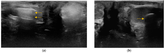 Examples of the content and shape of anal sacs in cats. (a) Oval-shaped right anal sac in a nine-month-old male cross-breed. The content is hypoechoic with hyperechoic points. (b) Round-shaped left anal sac (arrows) with echogenic content in an eight-month-old female cross-breed.
